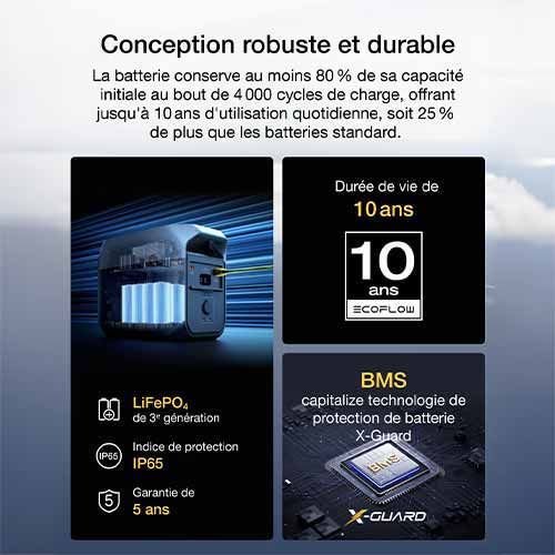 - Fabriquée avec des matériaux de qualité, cette batterie Ecoflow est résiliente et conçue pour résister aux conditions extérieures, ce qui assure une utilisation durable.